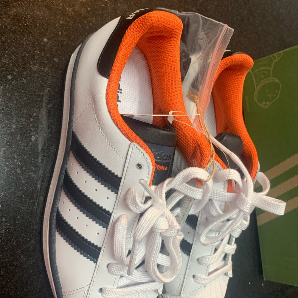 Experience the classic style of Adidas with these white and black Superstar sneakers. Featuring the iconic shell toe design and signature three stripes, these sneakers offer a timeless look. Perfect for any casual occasion, they combine comfort and style effortlessly.