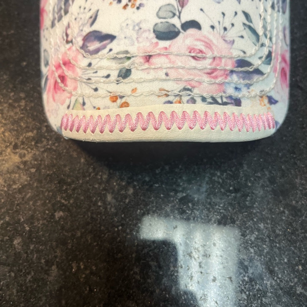 Stylish Robin Ruth kids cap featuring a vibrant floral design. Perfect for sunny days, this pink and white cap adds a fun touch to any outfit.